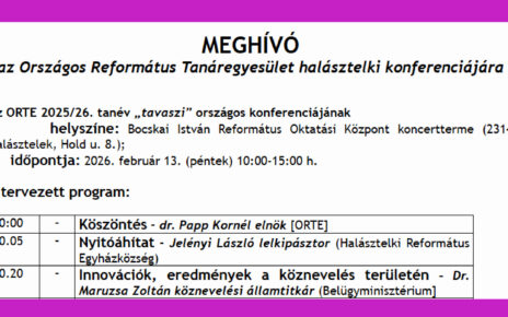 Az ORTE 2025/26. tanévi „tavaszi” országos konferenciájának helyszíne: Bocskai István Református Oktatási Központ koncertterme (2314 Halásztelek, Hold u. 8.); Időpontja: 2026. február 13. (péntek) 10:00-15:00 h. A konferencia helyszíne: